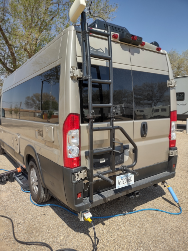 We installed an Aluminess Rear Door Ladder with Tire Carrier on the driver side back door. This took 2 days at my brother's house in Carmel Valley. Before Ladder With Ladder Installed.